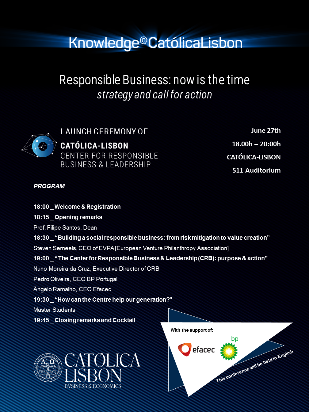 The first conference, held on February 5, aimed at launching the initiative and challenging civil society to join efforts and build a promising future for Portugal and for all of us. This conference was attended by Nuno Fernandes (Dean of Católica-Lisbon), Ricardo Reis, (Head of the Center for Applied Studies of the Catholic University), João Gomes da Silva (Administrator of Sogrape), Isabel Guerreiro (Head of Banco Santander), Paulo Pereira da Silva (President of Renova), and Ricardo Gonçalves Pereira (CEO of Yunit Consulting) who launched the challenge SME Heroes Awards.