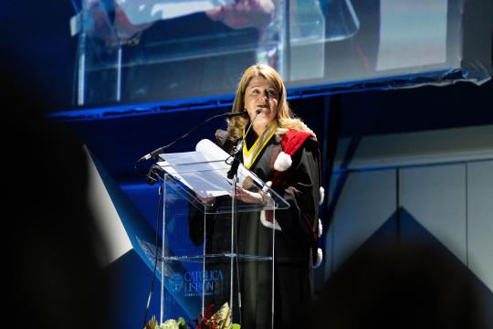 Following the presentation of diplomas, Rector Isabel Capeloa Gil took the stage to address the leaders of tomorrow. With her characteristic conviction, she called the graduates “the true champions” of the Class of 2025 and underlined that “the future will be as great as your courage to face it.” Acknowledging the complex challenges facing humanity, from climate change to artificial intelligence and growing inequality, she reaffirmed her faith in CATÓLICA-LISBON graduates: “This is not a time for walls, but for dialogue and respect for our shared humanity. The challenge of your time is to turn uncertainty into action.”