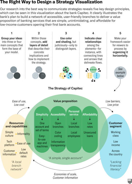Uma descrição verbal desta estratégia, embora convincente no momento, pode ser difícil de interiorizar para as pessoas que não a desenvolveram. Mas é possível captar quase perfeitamente num único diapositivo as relações e causalidades entre todos os conceitos que compõem a estratégia, como se pode ver num diapositivo que desenvolvemos e que é apresentado na exposição "A forma correta de conceber uma visualização estratégica". Nele pode ver-se facilmente os três principais conceitos estratégicos. No centro está a proposta de valor ("uma conta simples e única", com os seus quatro subconceitos e as suas expressões concretas). O principal segmento de clientes (pessoas "sem literacia financeira") está à direita, e os recursos e capacidades necessários ("uma rede de agências locais" e o que esta ofereceria) para satisfazer as necessidades do segmento estão à esquerda. A visualização também mostra como cada um dos três conceitos se interliga com os outros para criar uma dinâmica lucrativa.