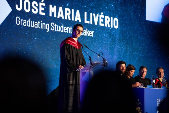 Antes da entrega dos diplomas, João Maria Livério, mestre em Management com especialização em Estratégia, Empreendedorismo & Impacto, foi chamado a palco como representante da classe de 2024 para partilhar algumas palavras com os colegas, que foram sua família nos últimos dois anos.
