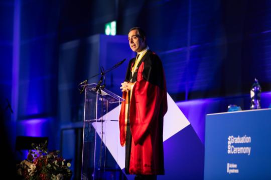 Após a entrega dos diplomas e a atribuição dos sonhos, Peter Hanenberg, Vice-Reitor da Universidade Católica Portuguesa, subiu ao palco para transmitir uma mensagem de esperança, destacando três palavras: gratidão, esperança e felicitação. Agradeceu aos graduados pela sua escolha pela Universidade e destacou o papel crucial das famílias e professores. Encorajou-os a manter viva a vontade de aprender, refletindo sobre os contrastes históricos do dia 9 de novembro – a queda do Muro de Berlim e a Kristallnacht - , e citou o Papa Francisco, desafiando-os a transformar adversidades em esperança. Finalizou com um apelo à coragem, afirmando: “Não sejamos administradores de medos, mas empreendedores de sonhos”.